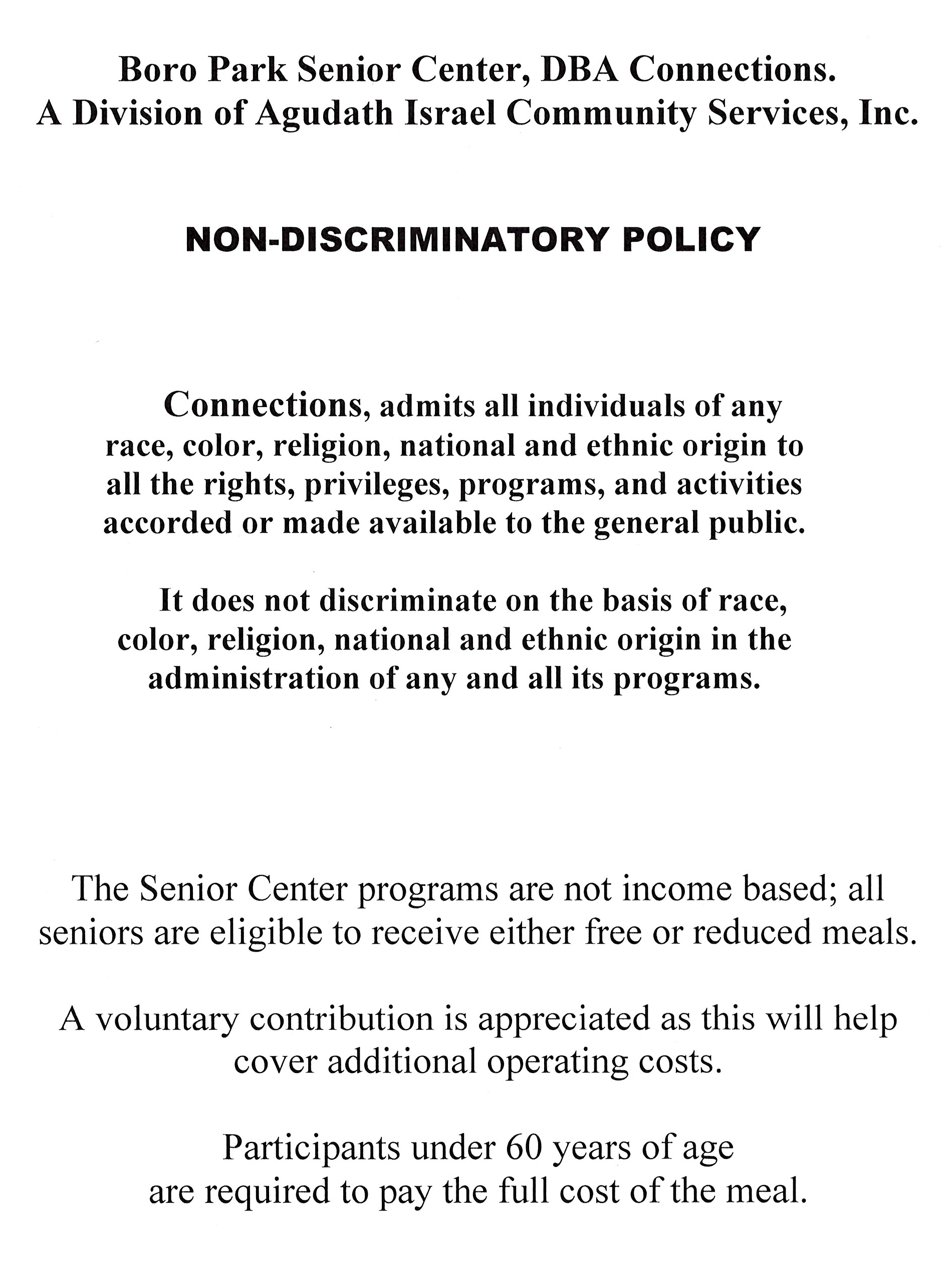 The program is partially funded by NYC Aging. We request participants to contribute a token amount per visit to help cover some of the program costs. Please note, no person will be denied a meal due to inability to pay.